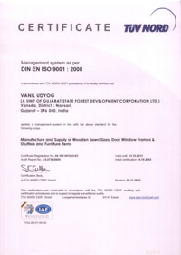 VanilUdyog has a state-of-art modern Saw Mill, Conventional and Solar Seasoning Plants, Wood Processing Plant, Doors-Windows & Furniture Joinery Unit, Wood Art and finishing sections wherein about 148 Tribal workers are at present engaged under supervision of qualified and experienced Engineers and quality products are manufactured as per the guidelines of Indian Standard Specifications. VanilUdyog has recently received ISO 9001:2001 certificate for its quality management system from RWTUV Germany, Emphasis is laid on conservation of precious teakwood by promoting usages of treated Non-teakwood timber by making it more or less comparable to teakwood. Non-teakwood is upgraded to the level of teakwood and yet reduces the cost by about 40% through chemical treatment and seasoning processes.